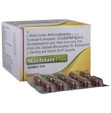 Macfolate plus capsule is a combination of Alpha lipoic acid, Benfotiamine, Docosahexaenoic acid, Eicosapentaenoic acid (EPA), Zinc, L-methylfolate, Levocarnitine, Methylcobalamin, Pyridoxal 5-phosphate and Vitamin D3. Macfolate plus Tablets contains all active form of vitamins would be rationale approach to prevent Neural Tube Defects (NTDs), pregnancy related anaemia and associated pregnancy complications due to elevated homocysteine levels. Role of key ingredients: L-methylfolate is the active form of folic acid used by your body. L-methylfolate is proven to lower levels of homocysteine (an amino acid linked to pregnancy complications). Mecobalamin deficiency is linked with increased risk of intrauterine growth retardation, abnormal embryo-foetal brain development, cleft palate and metabolic syndromes. Pyridoxal 5 Phosphate is the active form of vitamin B6 . B6 may play a role in the prevention of pre-eclampsia, where the mother’s blood pressure is high with large amounts of protein in the urine or other organ dysfunction, and in babies being born too early (preterm birth). Vitamin B6 may be helpful for reducing nausea in pregnancy. Benfotiamine and Alpha-lipoic acts as potent antioxidants that reduces free radicals and reduces the risk of complications associated with Diabetes Use under medical supervision